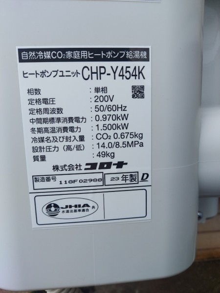 宇陀市 コロナ自然冷媒CO2家庭用ヒートポンプ給湯機ヒートポンプユニットCHP-Y454K エコキュート交換工事
