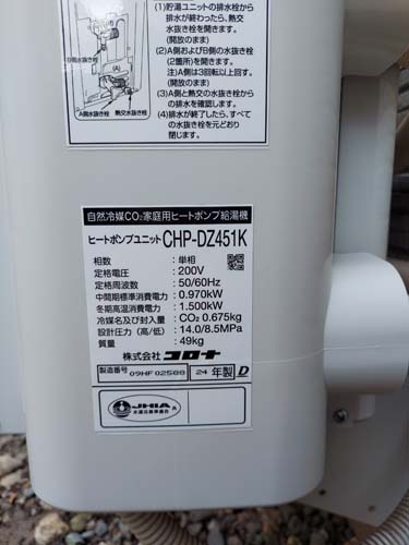黒滝村 コロナエコキュート→コロナ自然冷媒CO2家庭用ヒートポンプ給湯機 ヒートポンプユニットCHP-DZ451K エコキュート交換工事
