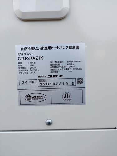 明日香村 コロナ自然冷媒CO2家庭用ヒートポンプ給湯機貯湯ユニットCTU-37AZ1K、ヒートポンプユニットCHP-DZ451K エコキュート交換工事